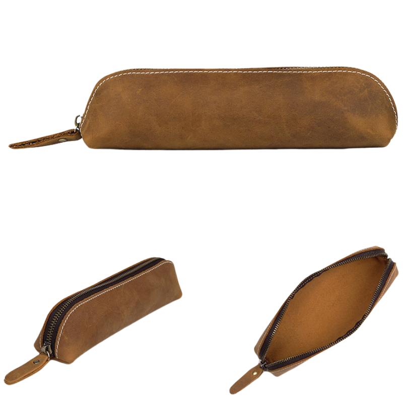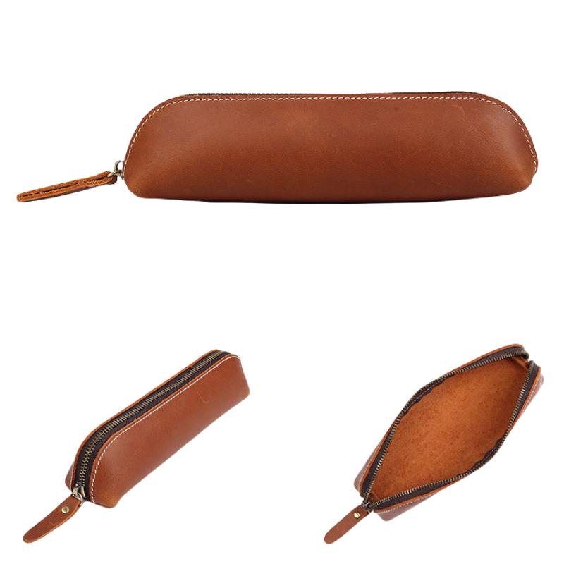 This leather pen pouch is convenient as it can hold pens, pencils, erasers, glasses, charging cables, and headphones.